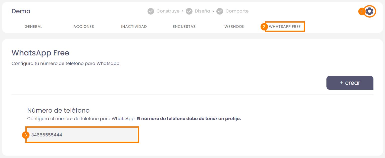 Como primer paso, debemos entrar a la configuración de nuestro proyecto, mediante el icono de la rueda dentada (1) y seleccionar la pestaña WhatsApp Free (2).