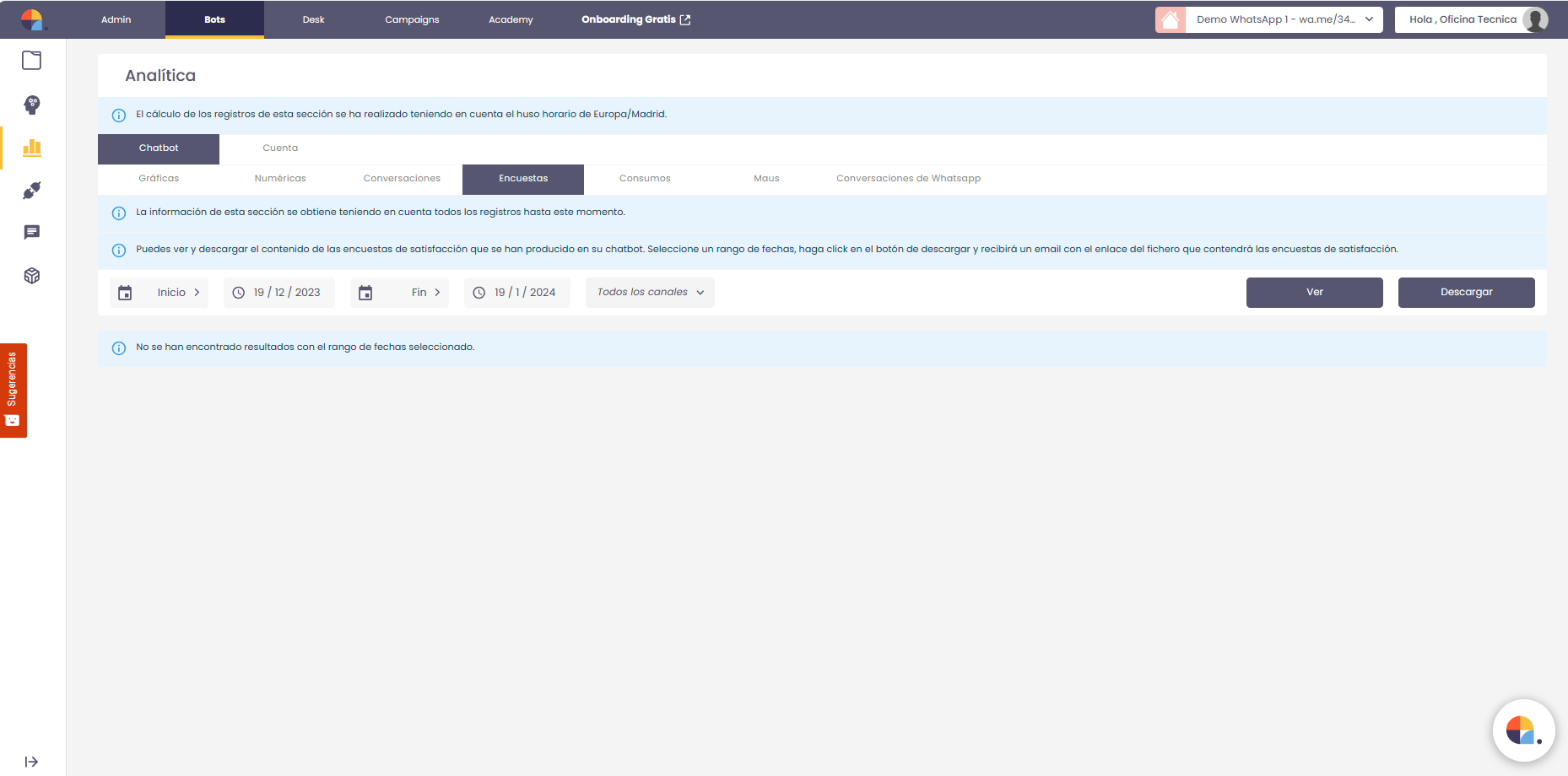 Es posible definir el período de tiempo que nos interese para ver o descargar las respuestas de la encuesta, así como acotar el canal en el que se ha producido la interacción con el usuario.