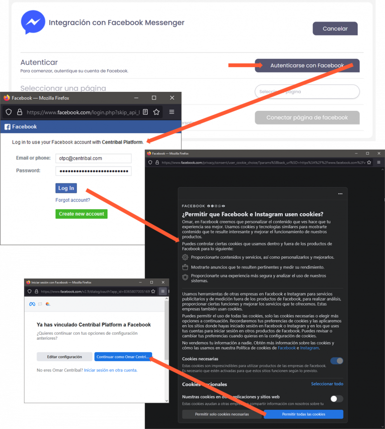Una vez autenticados, aceptamos las cookies que veamos necesarias y nos confirmarán que ya tenemos conexión con Facebook.