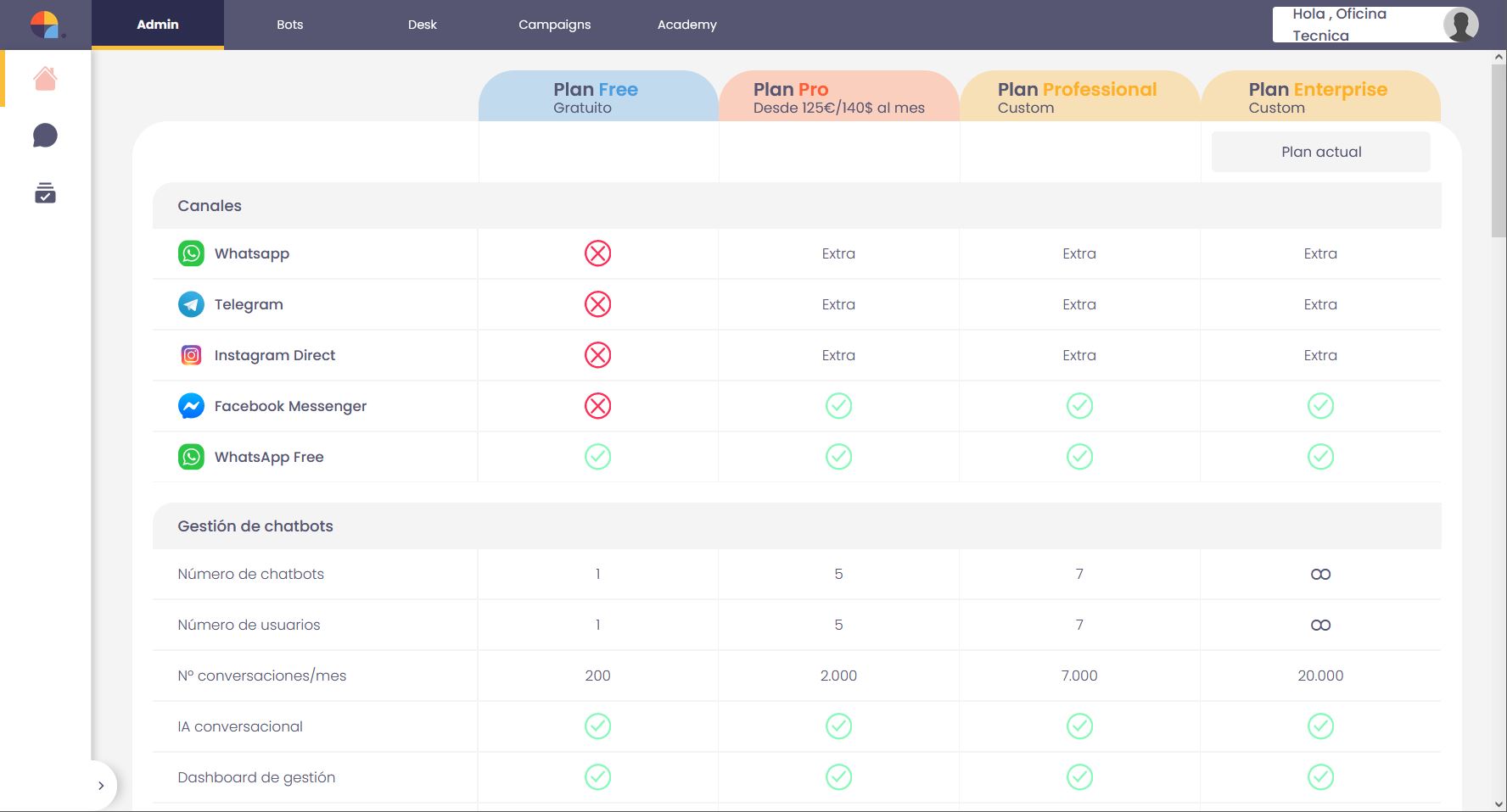 Esta pantalla inicial te mostrará la comparación de los distintos planes de Plataforma Centribal y sus características.