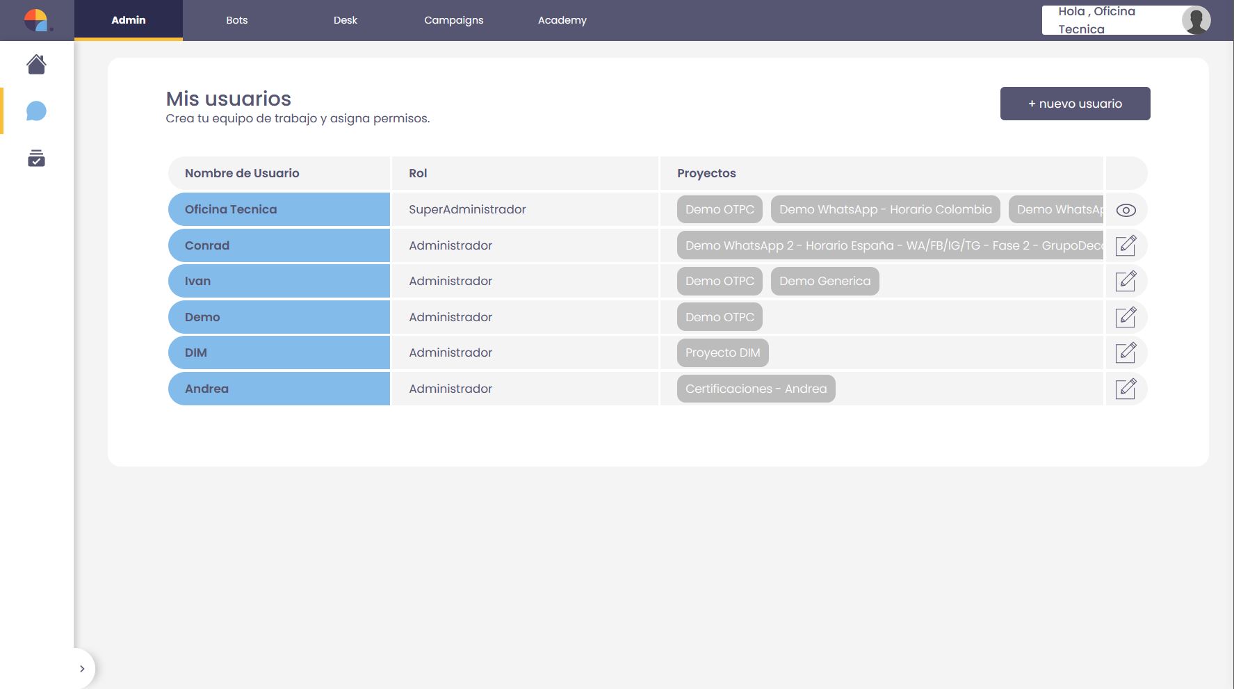 Si eres el usuario que ha creado la cuenta, tu rol en Plataforma Centribal es SuperAdmin. Este rol te permitirara administrar a los usuarios de tu cuenta, asignarles acceso a los proyectos de chatbots o asignarle otros roles que van ligados al modulo Desk.