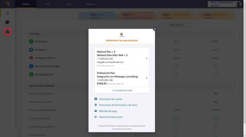 El tercer icono de la columna izquierda nos mostrará el dialogo con la información de nuestra cuenta, como plan activo, información de nuestro usuario, y la información de facturación y pagos.