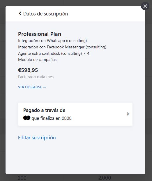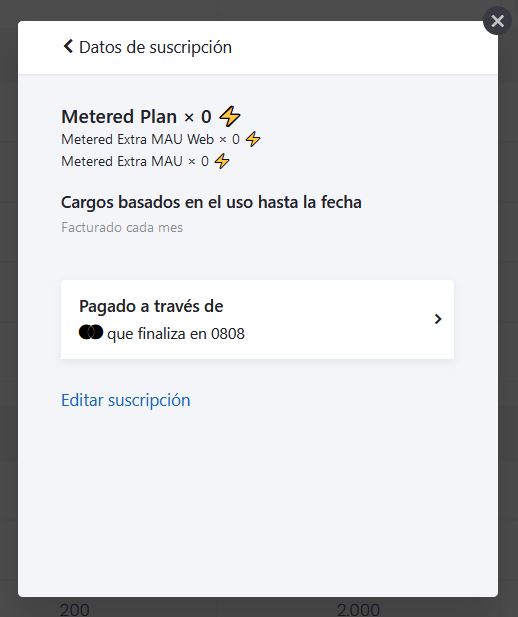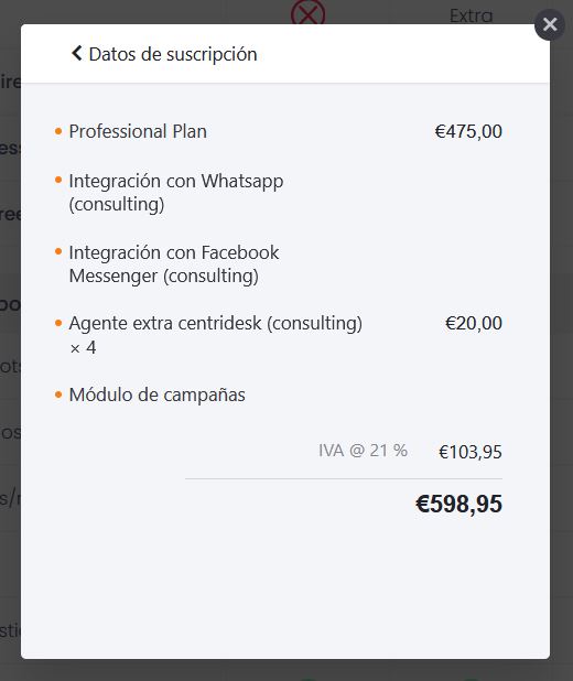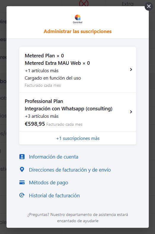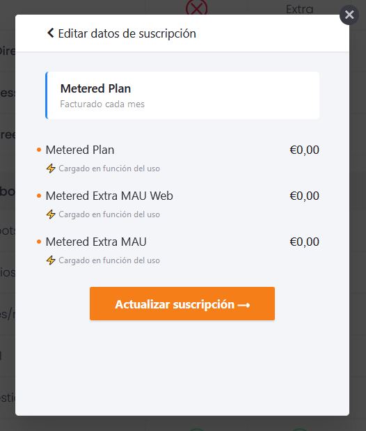 Si hacemos clic en Editar suscripción nos mostrará el costo de los adicionales de Plataforma Centribal, como los MAU extras.