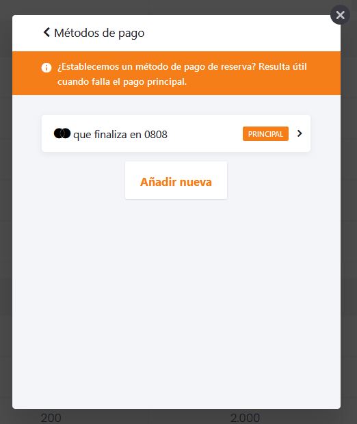 Para hacer un cambio en el método de pago, seleccionamos el enlace correspondiente en el panel inicial y nos mostrara el método actualmente activo y la posibilidad de añadir uno nuevo.