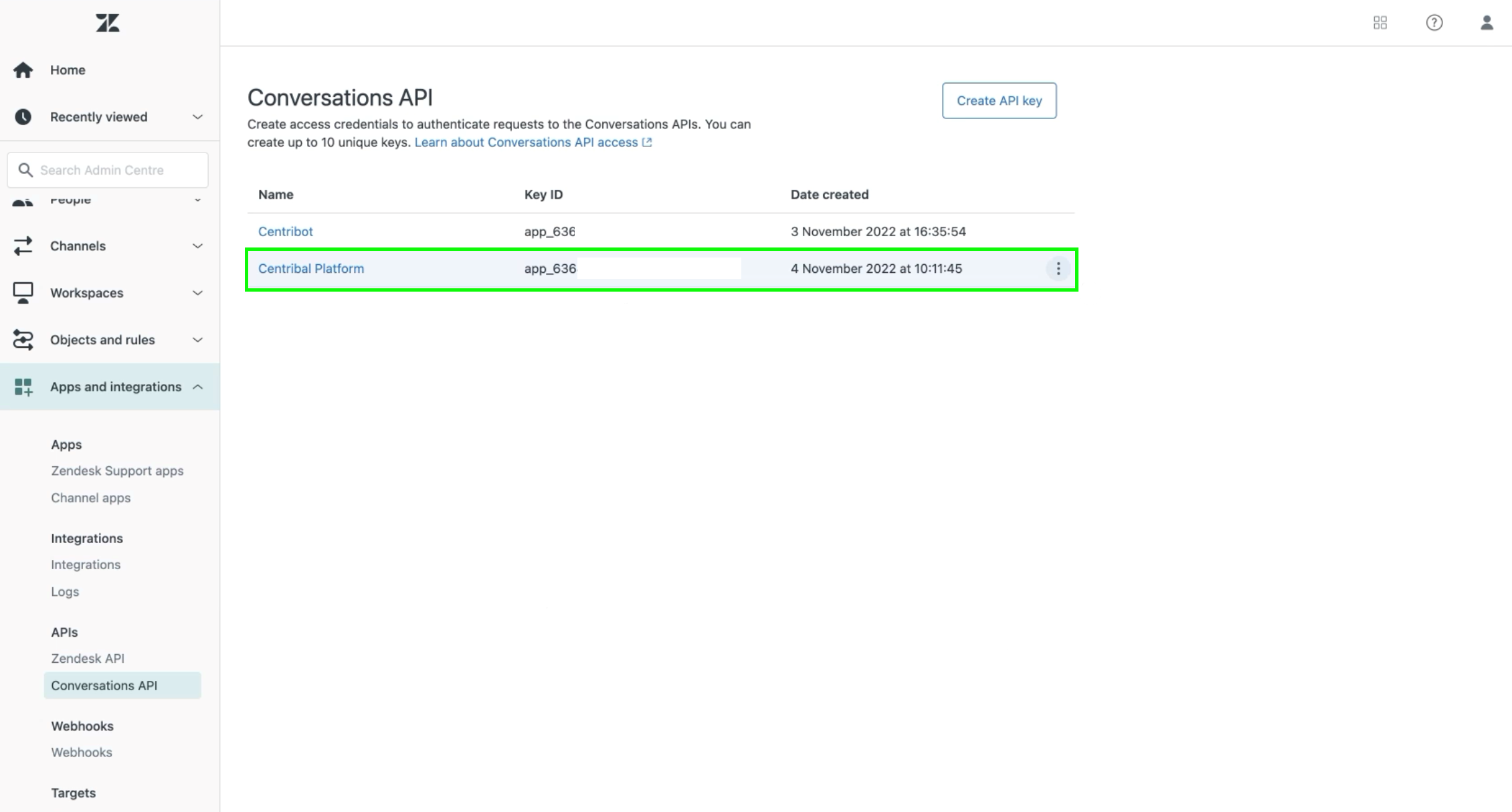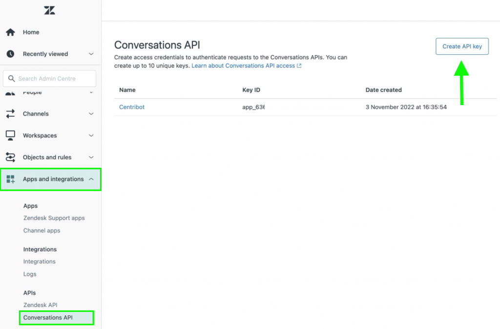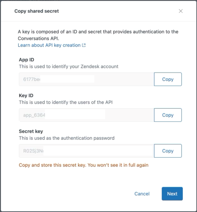 Puedes encontrar el App ID, la Key ID y el Secret ID en el Zendesk Admin Center siguiendo el siguiente camino: