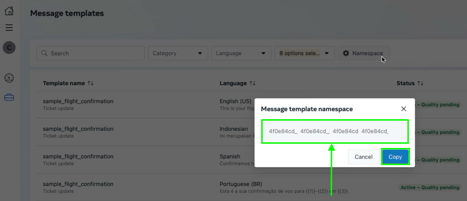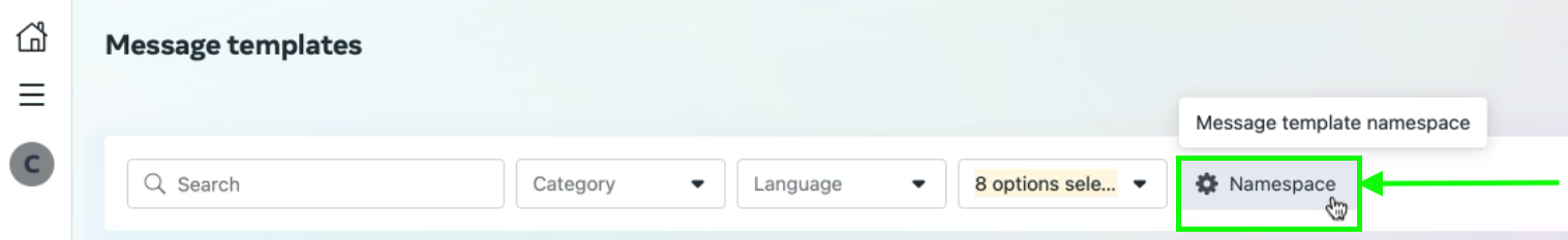 El WhatsApp Namespace lo puedes encontrar igualmente en tu Facebook Business Account o puedes preguntar a tu contacto de SunCo, o quien administre tu WABA.