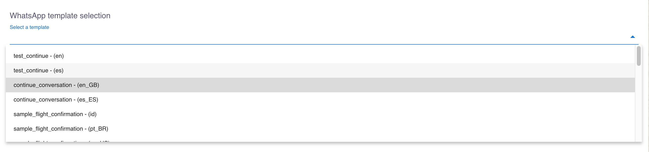 Una vez que has seleccionado el número de teléfono con el que quieres hacer el envío, aparece el desplegable para elegir la plantilla de la lista de plantillas aprobadas de WhatsApp: