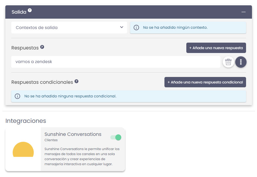 Simplemente, entramos en el intent o los intents que generen este hand-off, hacemos scroll con el ratón hasta llegar al final y nos aparecerá en Integraciones el activador de SunCo. Una vez esté marcado en color verde, la interacción de este intent generará un ticket en la instancia de Zendesk.
