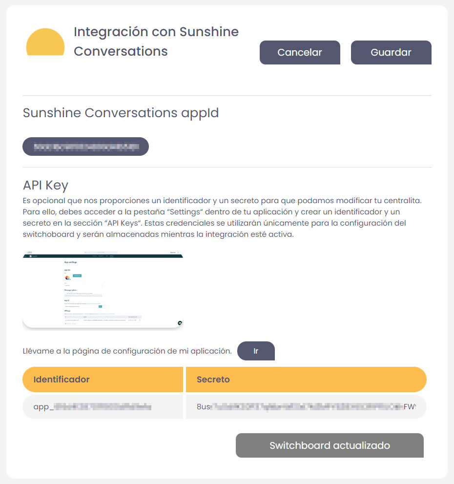 Opcionalmente, se puede solicitar la configuración automática desde la aplicación de Sunshine Conversations o configurarlo mediante software siguiendo la documentación en el siguiente enlace: https://docs.smooch.io/guide/switchboard/#switchboard